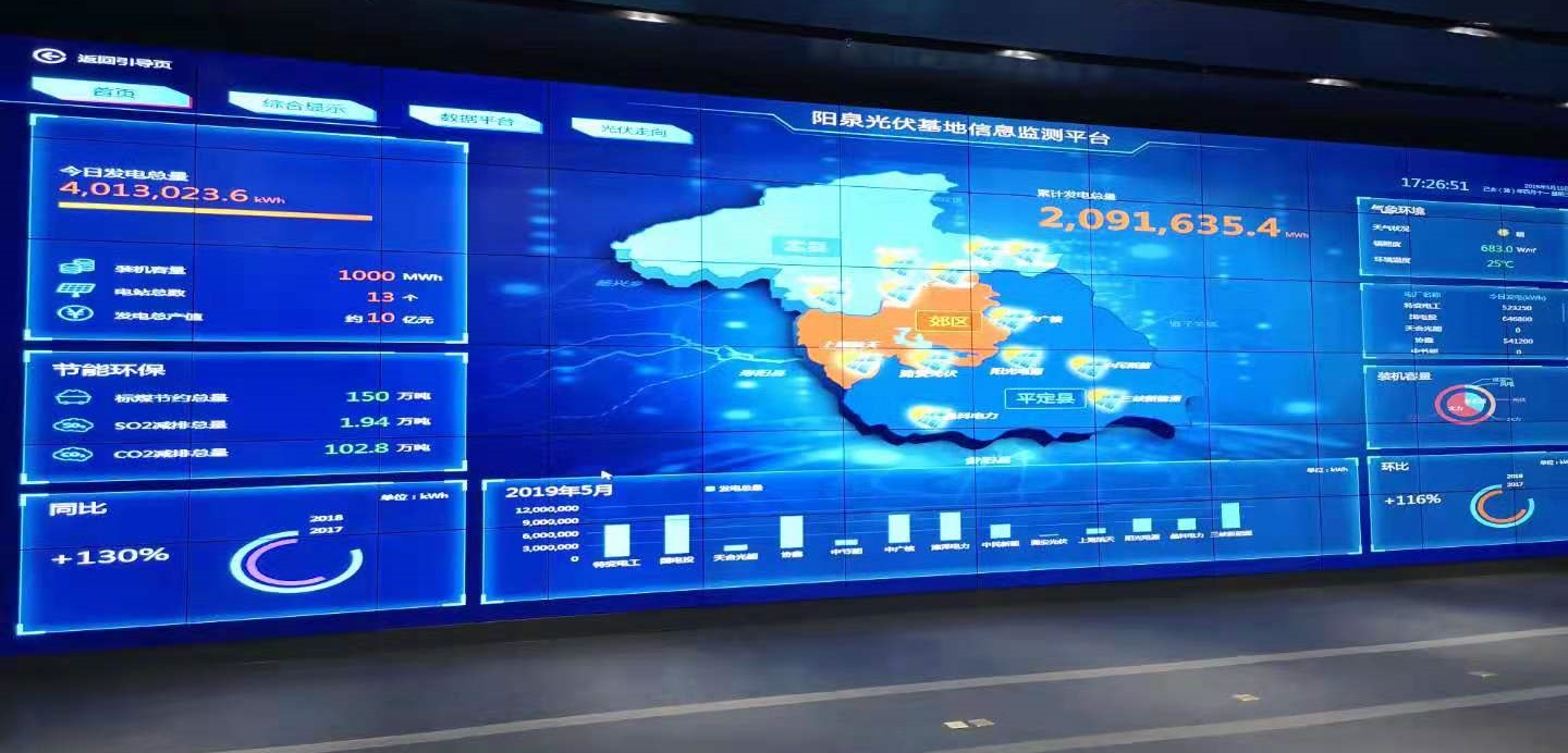 信息平臺匯集了光伏領(lǐng)跑者項目十三家投資商的實時發(fā)電數(shù)據(jù)、地理位置、具體信息。整個項目裝機容量為1000MW(兆瓦),年發(fā)電總產(chǎn)值約10億元。以及在建和列入開發(fā)方案的共計48萬千瓦風(fēng)電項目。為拓寬平臺的服務(wù)領(lǐng)域,實現(xiàn)平臺的綜合化利用,該平臺除實現(xiàn)對光伏基地整體運行情況的實時監(jiān)測外,還可以通過可視會議系統(tǒng),實時連線重點工程情況。